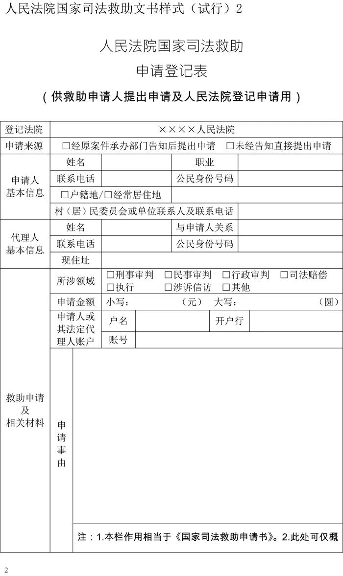 第二条 人民法院通过立案窗口(诉讼服务中心)和网络等渠道公开提供国家司法救助申请须知、申请登记表等文书样式。